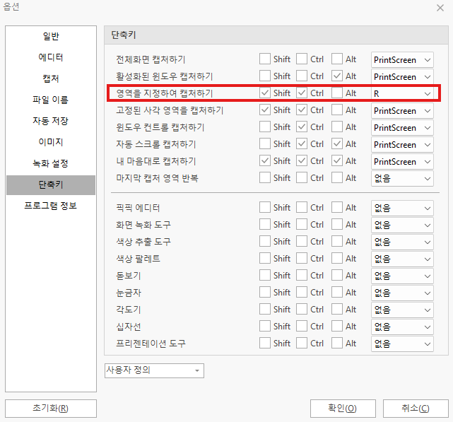 저는 프린트 스크린 키가 먼데 자주 사용하는 캡처 방식이라서 단축키를 Shift + Ctrl + R로 변경했습니다.(예전에는 이게 기본이었는데 업데이트되면서 변경되었더라고요..)