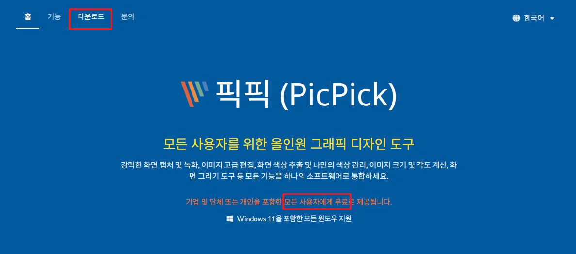 아래 픽픽(PicPick) 홈페이지에서 다운로드 받을 수 있습니다.