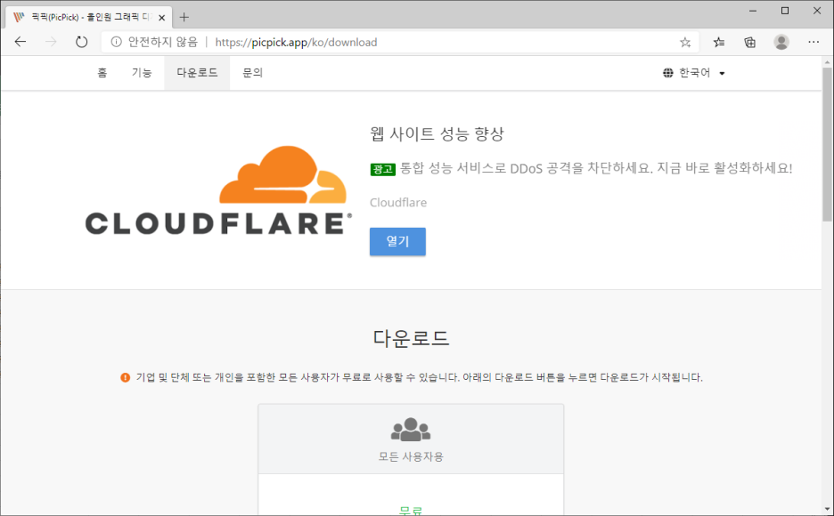 다운로드 버튼을 통해 픽픽 무료 다운을 할 수 있으며, 다운로드 후 설치합니다.