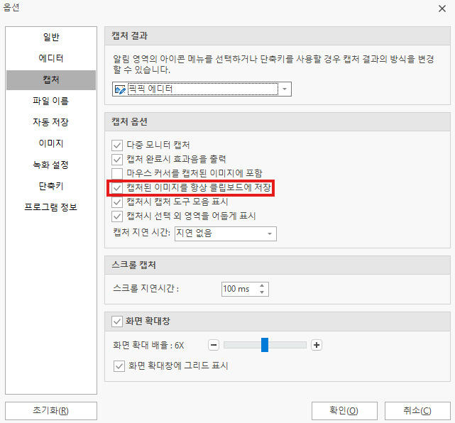 - 캡처된 이미지를 항상 클립보드에 저장 : 캡처 완료 후 클리보드에 자동으로 저장되어 다른 프로그램에 바로 붙여넣기(Ctrl+V)하여 사용 할 수 있어요.