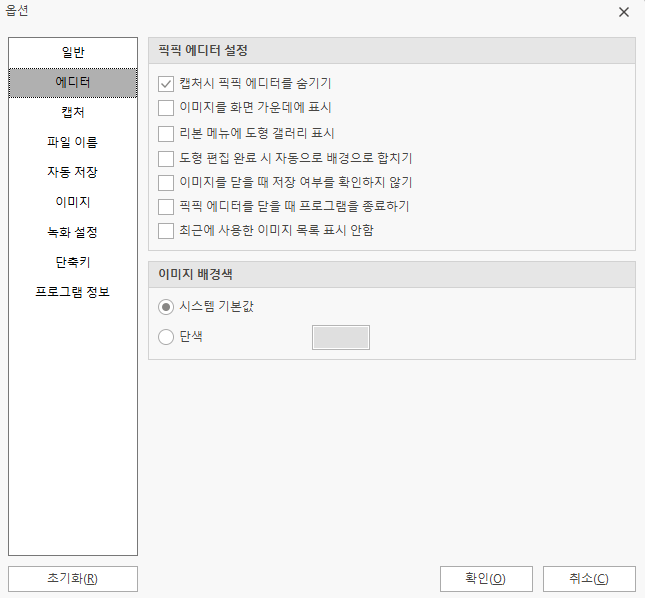 에디터 탭에서는 캡처시 픽픽 에디터를 숨기기 만 체크해 주었어요.