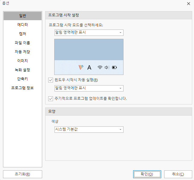 - 프로그램 시작 모드 : 알림 영역에만 표시