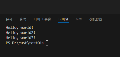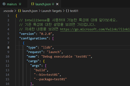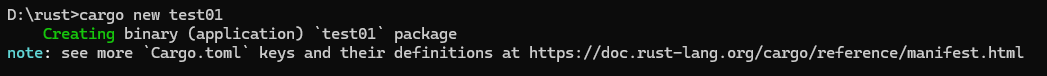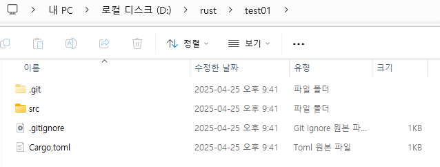 위 명령어를 실행 시 해당 폴더 하위에 test01 폴더가 생성되며 rust 프로젝트가 자동으로 설정됩니다.