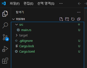 탐색기에서 확인해 보면 자동으로 rust 프로젝트가 설정된 걸 확인할 수 있어요.