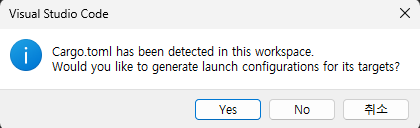 확인을 누르면 cargo.toml 을 자동으로 감지했는데, launch configurations를 구성할꺼냐고 물어보네요.